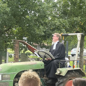 Zahlreiche bunt geschmückte Traktoren säumten die Wiese rund um die Grillhütte, wo der Gottesdienst unter freiem Himmel gefeiert wurde. Die Predigt von Pfarrer Hans Peter Gieß, auf einem alten Traktor sitzend, nahm Bezug auf Natur, Landwirtschaft und Gemeinschaft und wurde musikalisch stimmungsvoll von Bläsern umrahmt.