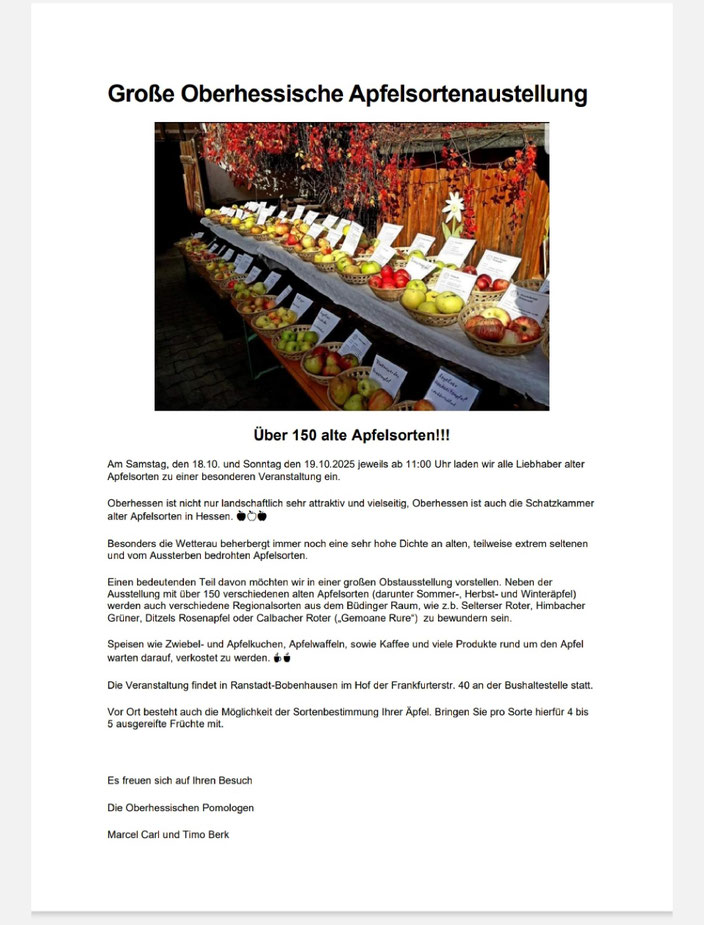 Apfelweinfest mit Apfelausstellung in der Volkshalle... wie immer mit Mittagessen und leckerem Kuchen